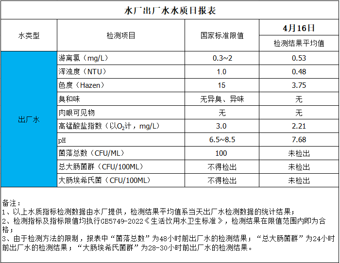 水廠出廠水水質(zhì)日?qǐng)?bào)表(2025-4-16)
