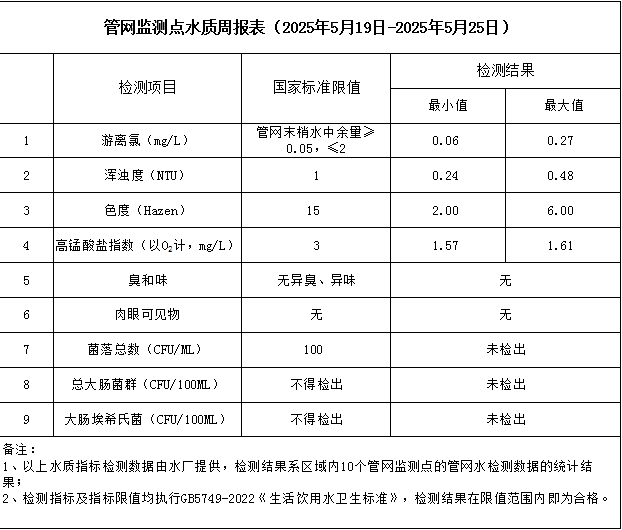 管網(wǎng)監(jiān)測(cè)點(diǎn)水質(zhì)周報(bào)表(2025年5月19日-2025年5月25日)