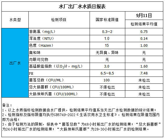水廠出廠水水質(zhì)日報表(2025-9-11)