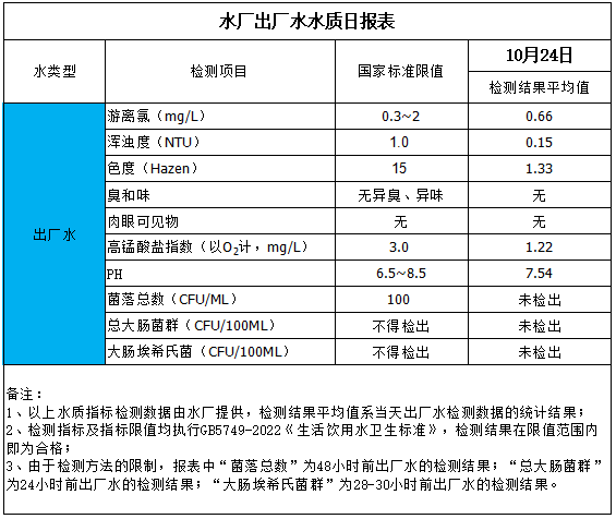水廠出廠水水質(zhì)日?qǐng)?bào)表(2025-10-24)
