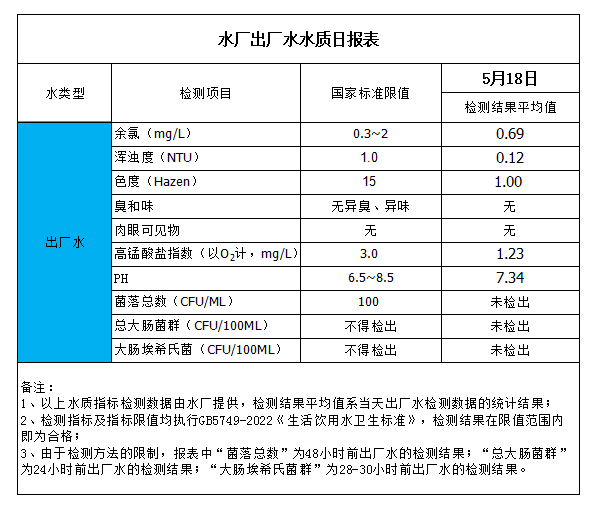 水廠(chǎng)出廠(chǎng)水水質(zhì)日?qǐng)?bào)表(2023-5-18)