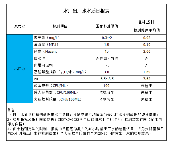 水廠出廠水水質(zhì)日?qǐng)?bào)表(2023-8-15)