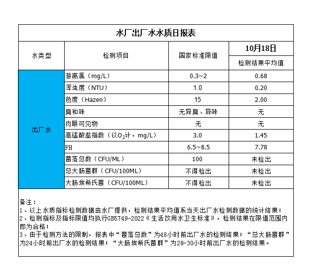 水廠出廠水水質(zhì)日?qǐng)?bào)表(2023-10-18)