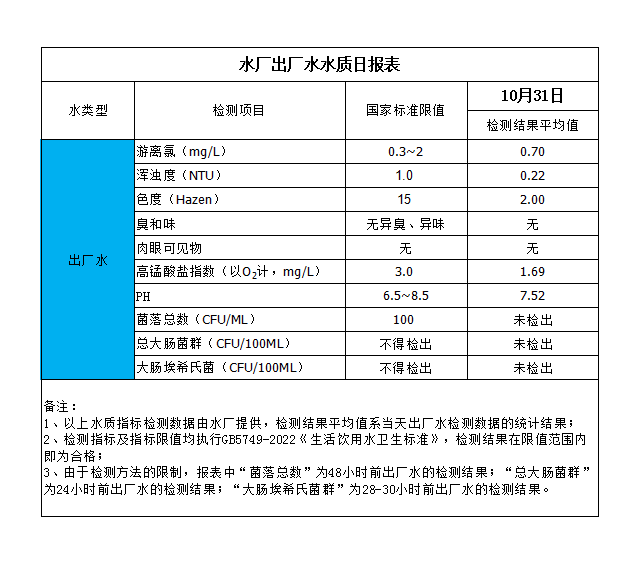 水廠出廠水水質日報表(2023-10-31)