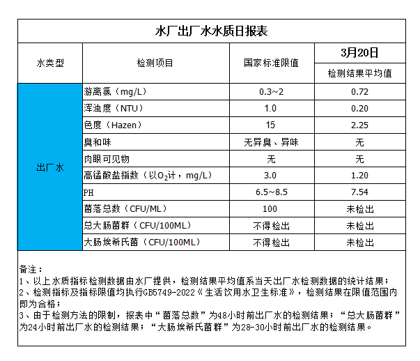 水廠出廠水水質(zhì)日?qǐng)?bào)表(2024-3-20)