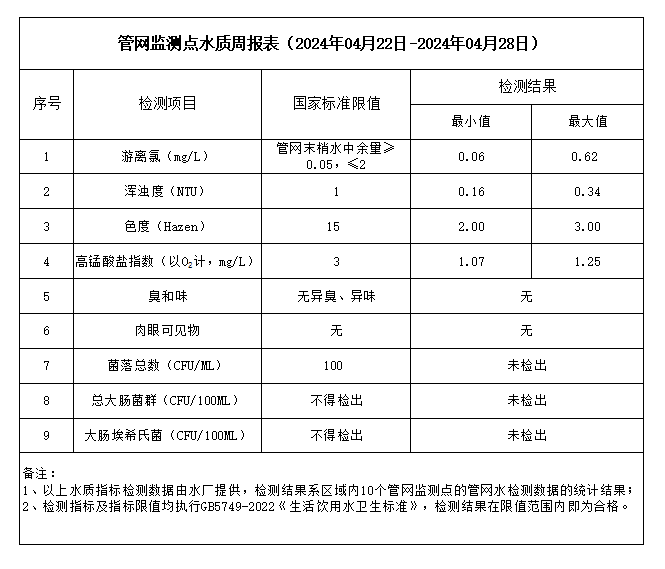 管網(wǎng)監(jiān)測(cè)點(diǎn)水質(zhì)周報(bào)表(2024年04月22日-2024年04月28日)