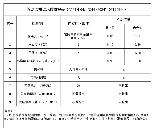 管網(wǎng)監(jiān)測點(diǎn)水質(zhì)周報(bào)表(2024年04月29日-2024年05月05日)