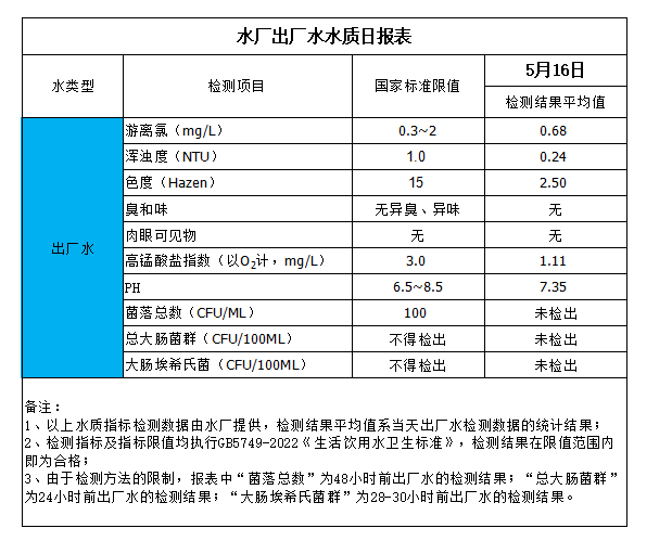 水廠出廠水水質(zhì)日?qǐng)?bào)表(2024-5-16)