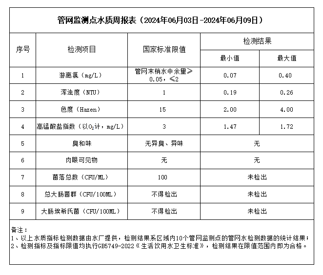 管網(wǎng)監(jiān)測點水質(zhì)周報表(2024年06月03日-2024年06月09日)