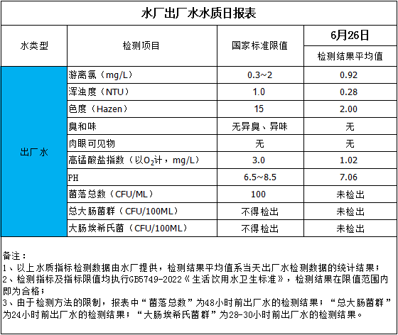 水廠出廠水水質(zhì)日報表(2024-6-26)