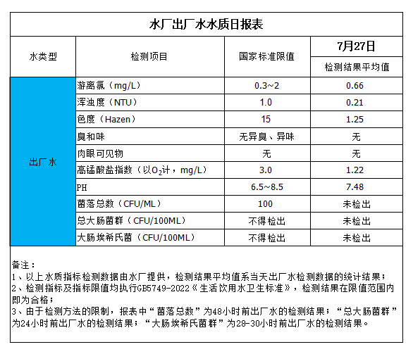 水廠出廠水水質(zhì)日?qǐng)?bào)表(2024-7-27)